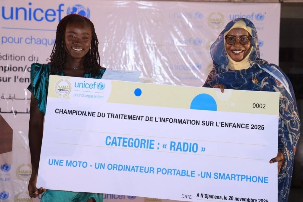 À l’occasion de la Journée mondiale de l’enfance, l’UNICEF Tchad, en partenariat avec la Haute Autorité des Médias et de l’Audiovisuel (HAMA), a procédé ce 20 novembre 2025 à la cérémonie de distinction des lauréats de la 5ᵉ édition du Concours de journalisme dédié aux questions de l’enfance. Une initiative devenue incontournable pour encourager un traitement médiatique responsable, sensible et professionnalisé des enjeux touchant les enfants au Tchad.