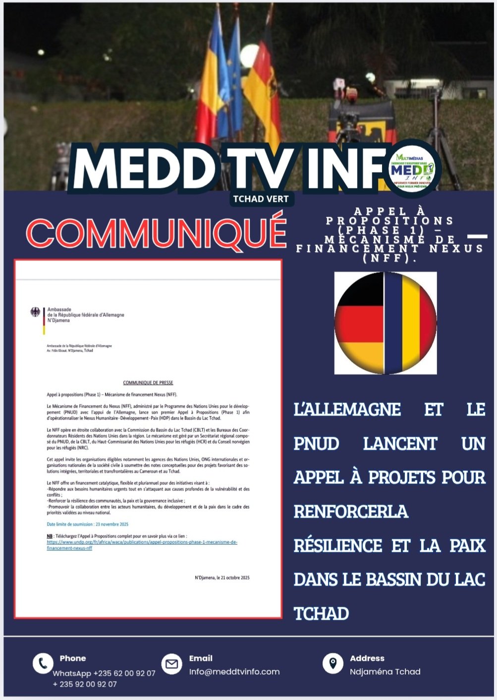 N’Djamena, 21 octobre 2025 – L’Ambassade de la République fédérale d’Allemagne au Tchad, en collaboration avec le Programme des Nations Unies pour le développement (PNUD), annonce le lancement de la première phase de l’Appel à Propositions du Mécanisme de Financement Nexus (NFF). Ce dispositif vise à promouvoir une approche intégrée Humanitaire–Développement–Paix (HDP) dans les zones fragiles du Bassin du Lac Tchad, notamment au Cameroun et au Tchad.