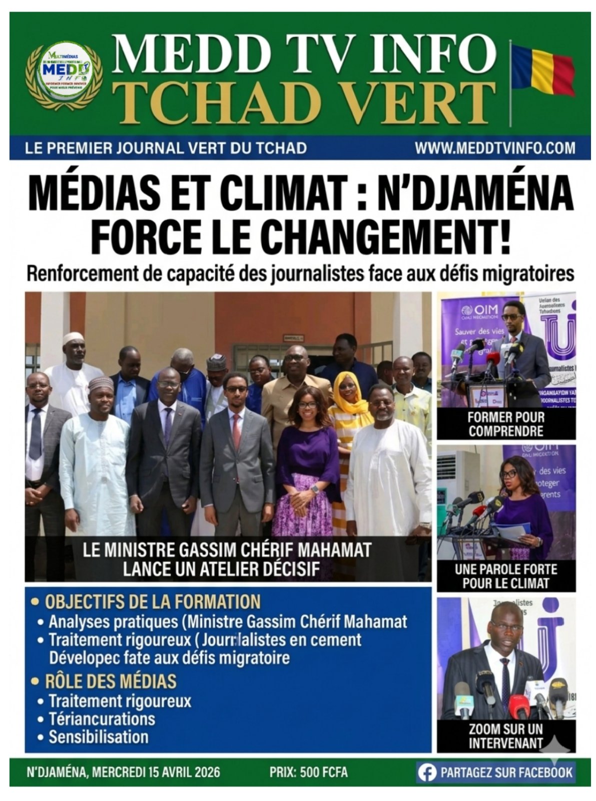 N’Djaména, 15 avril 2026 – Un pas décisif vient d’être franchi dans la professionnalisation du traitement médiatique des enjeux climatiques au Tchad. Le Ministre de la Communication, Porte-parole du Gouvernement, Gassim Chérif Mahamat, a procédé ce mercredi au lancement officiel d’un atelier national de formation des journalistes sur la migration liée au changement climatique et aux dynamiques de la main-d’œuvre.