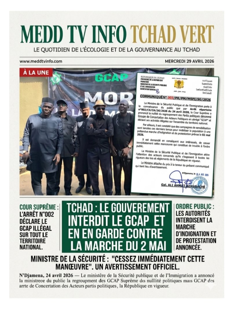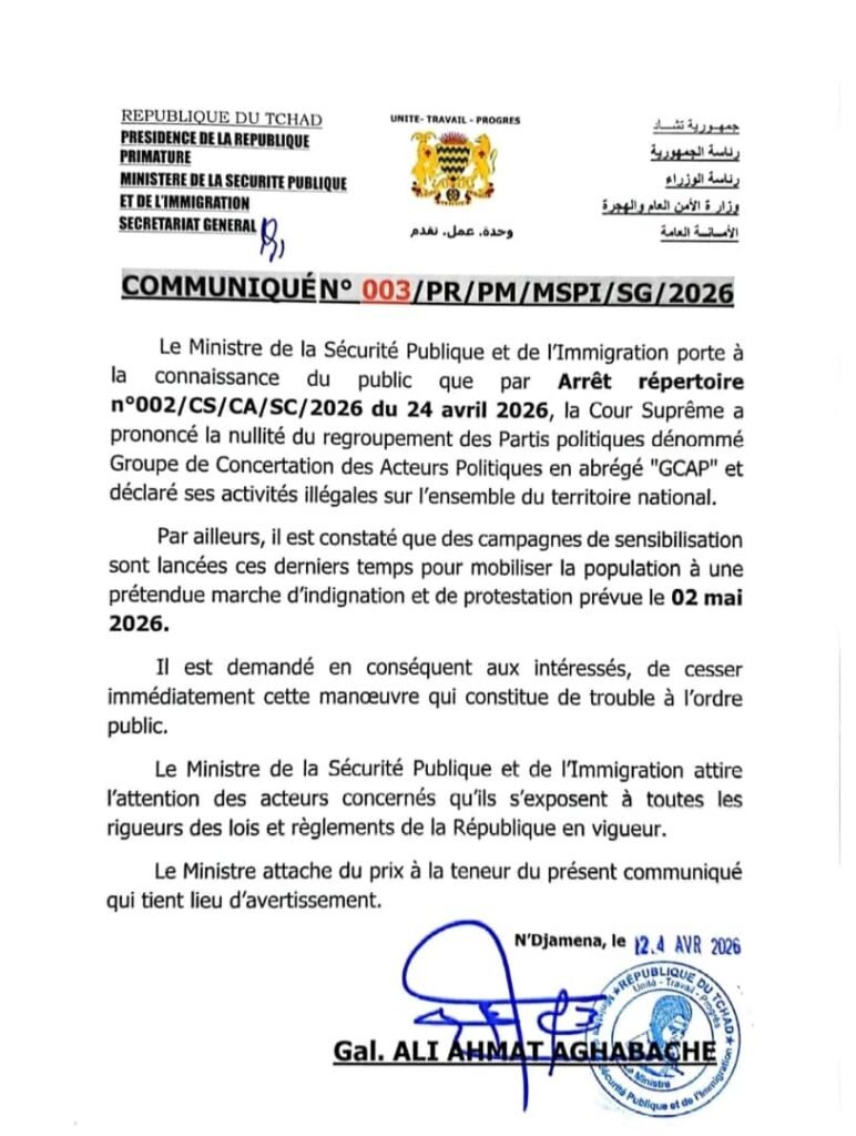 N’Djamena, 24 avril 2026 — Le ministère de la Sécurité publique et de l’Immigration a annoncé, à travers un communiqué officiel, la nullité du regroupement politique dénommé Groupe de Concertation des Acteurs Politiques (GCAP), à la suite d’une décision rendue par la Cour suprême.